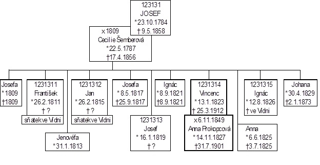 V listopadu téhož roku 1849 zažila Josefova rodina také jednu šťastnější událost, protože Vincenc se ženil s Annou Prokopcovou, dcerou zámožného sedláka Josefa Prokopce ze statku čp.18. Nevěsta měla dostat věnem chalupu, která měla být teprve postavena na zahradě statku. Josef otec se rozhodl, že stavení č. 211 prodá synu Josefovi za 240 zlatých s tím, že Vincenc v čp. 211 ještě zůstane a bude provozovat kovářství až do doby, než se bude moci přestěhovat do chalupy od Prokopců. Kup byl zapsán 29.11.1853.