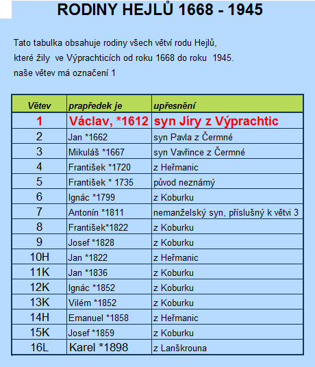 Do roku 1682 byla ve Výprachticích jen jedna větev Hejlů, a to větev výprachtická a dáme jí kód "1". Jejím nejstarším doloženým představitelem byl Václav (*asi 1612) a bude mít kód "1". Kód všech mužů této větve bude začínat jedničkou (1. . .).