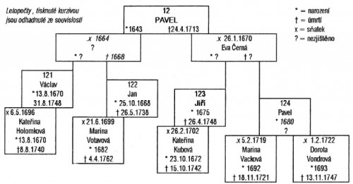 Pavel (12) se tedy narodil v roce 1643. Víme celkem spolehlivě, že první Pavlův syn Václav se narodil roku 1665. Neuděláme chybu, když budeme předpokládat, že první Pavlův sňatek se uskutečnil v r.1664. Narození druhého Pavlova syna Jana už známe naprosto přesně. Bylo to 25.10.1668. Porod asi nebyl bez problémů a Pavlova první žena zemřela. Pavel se ocitl sám s novorozenětem a dalším tříletým děckem. Proto nevyčkal obvyklých dvou let smutku a už 26.1.1670 se oženil s Evou Černou, dcerou Martina Černého z Horních Heřmanic.